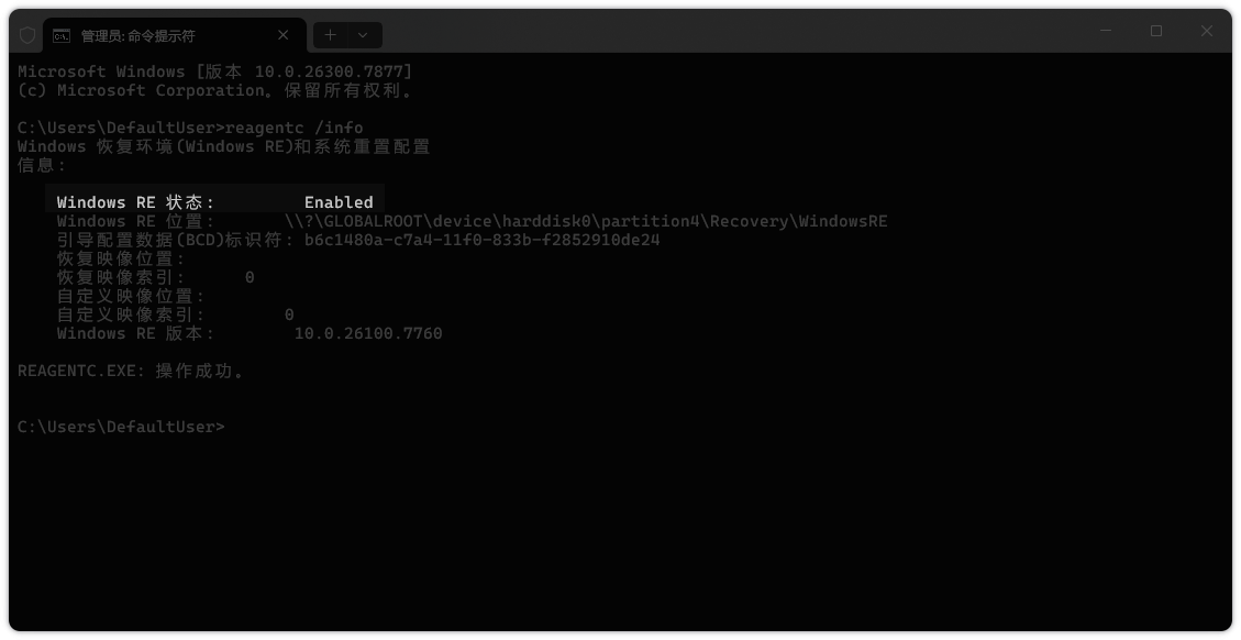 reagentc /info 完成后,检查输出的 Windows RE 状态,它理应为 Enabled。