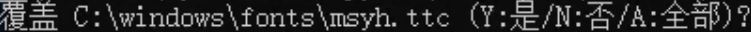 xcopy 您存放字体的文件夹(记得替换我) C:\Windows\Fonts\此操作将会替换 Fonts 中的字体文件 ,输入之后会提示是否覆盖,如下图,这里键入 A 并回车。